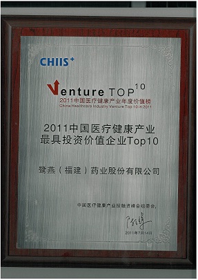 2011年7月14日,在北京舉辦的2011第五屆中國醫(yī)療健康產業(yè)投融資峰會上,鷺燕(福建)藥業(yè)股份有限公司榮獲“2011中國醫(yī)療健康產業(yè)最具投資價值企業(yè)TOP10”稱號。公司于2010年引進建銀國際醫(yī)療產業(yè)基金等投資者近1.5億元投資后,在公司治理、經(jīng)營業(yè)績、戰(zhàn)略布局等方面得到進一步提升,鞏固了公司在福建省醫(yī)藥流通領域的龍頭地位。